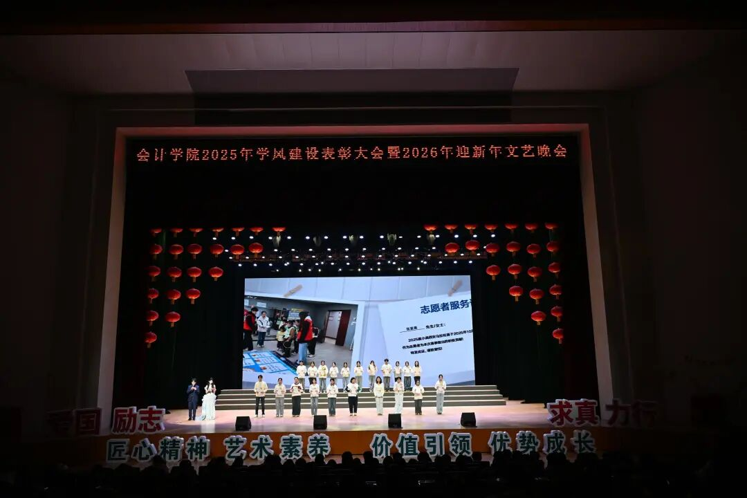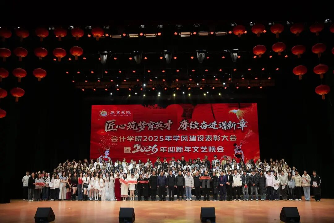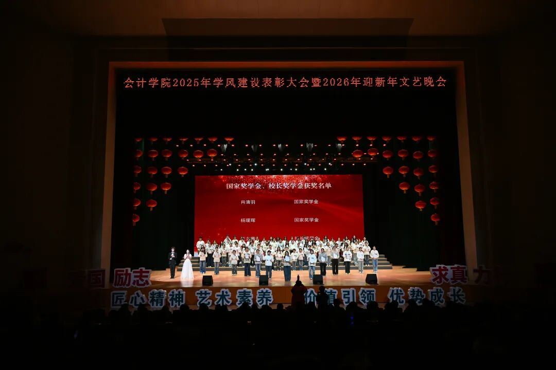 时序更迭,新程启幕。12月22日19:00,会计学院2025年学风建设表彰大会暨2026年迎新年文艺晚会在京华礼堂圆满举行。副校长王正斌、体育与美育教育中心、马克思主义学院、行健书院相关领导出席,各系教师、班主任、辅导员与全体学生欢聚一堂,回溯2025年的耕耘足迹,共赴2026年的璀璨新程。