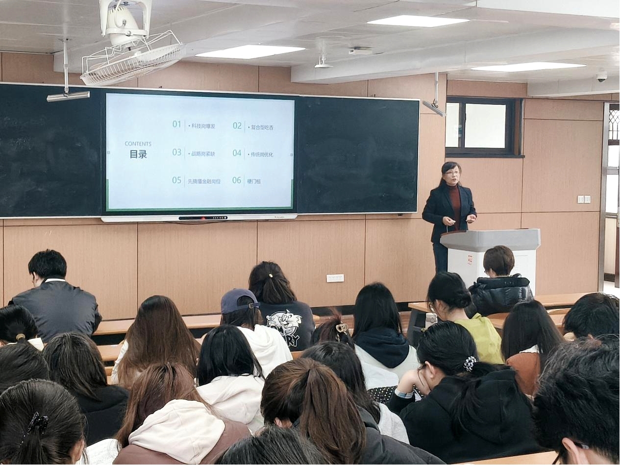 讲座中,袁晓燕结合其36年金融行业深耕实践经验,从金融行业发展趋势、岗位分类匹配、求职硬门槛要求、校招全流程路径等维度展开系统讲解。她指出,当前金融业正加速向数智化、绿色化转型,科技岗需求爆发、复合型人才备受青睐、战略岗人才紧缺成为行业显著特征,传统岗位也正朝着智能化、集约化方向优化升级。同时,针对银行、证券、保险三大金融赛道的校招核心差异、岗位能力要求及职业发展前景进行对比分析,明确不同赛道的适配人群与核心能力需求。